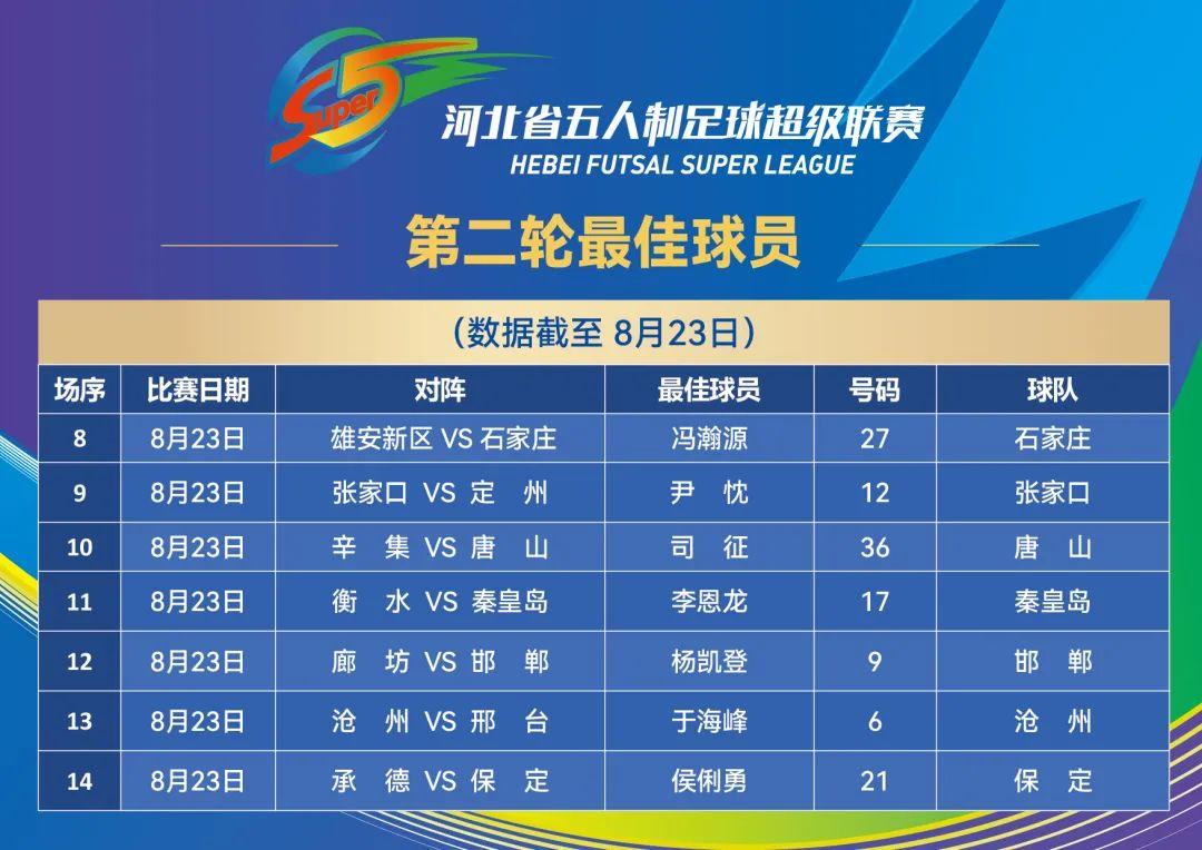 本轮最佳球员评选结果也同步揭晓。石家庄队冯瀚源、张家口队尹忱、唐山队司征、秦皇岛队李恩龙、邯郸队杨凯登、沧州队于海峰以及保定队侯俐勇当选本轮最佳球员。
